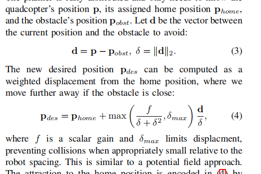 交互避障模式是对于已知位置的单个移动障碍物,例如人类,我们使用专门的避障模式。计划者是完全分布式的,只需要知道无人机的位置 p,其分配的起始位置 phome, 和障碍物的位置 pobst,通过计算可以得到避障距离,那么新的目标位置就可以被计算出来,而且作为一种从原始位置的加权位移。相关的公式如下图。